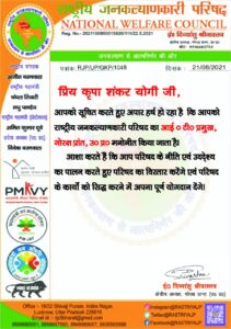 जिसके लिए राष्ट्रीय जनकल्याणकारी परिषद् के शीर्ष नेतृत्व का आभार व्यक्त करते हुए माननीय भारत देश के गौरव प्रधानमन्त्री श्री नरेंद्र मोदी की जनकल्याणकारी योजनाओं को देश के सभी नागरिकों तक पहुंचाने का काम करेंगे कृपा शंकर योगी ने कहा कि मुझे बताते हुए हार्स हो रहा है कि मुझे यह जिम्मेदारी मिली-