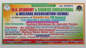 गणतंत्र दिवस के अवसर पर एम.ए.एकेडमी तुर्कमानपुर में झंडारोहण एवं सांस्कृतिक कार्यक्रम का आयोजन किया जाएगा। कार्यक्रम एम.ए.एकेडमी और सनराइज एजुकेशनल एंड वेलफेयर एसोसिएशन (सेवा) के संयुक्त तत्वावधान में 26 जनवरी को प्रातः 9 बजे से शुरू होगा।