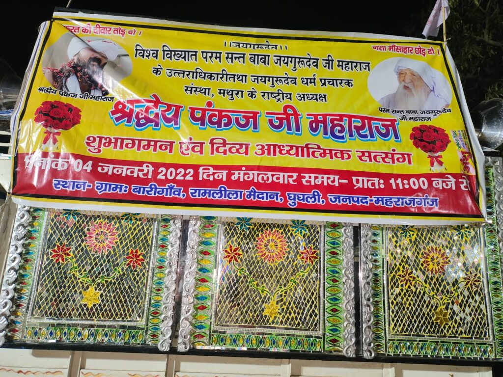 विश्व विख्यात परम संत बाबा जय गुरुदेव महराज के उत्तराधिकारी एवं जयगुरुदेव धर्म प्रचारक संस्था मथुरा के राष्ट्रीय अध्यक्ष का पूज्य पंकज जी महाराज आगमन आज 04/01/2022-